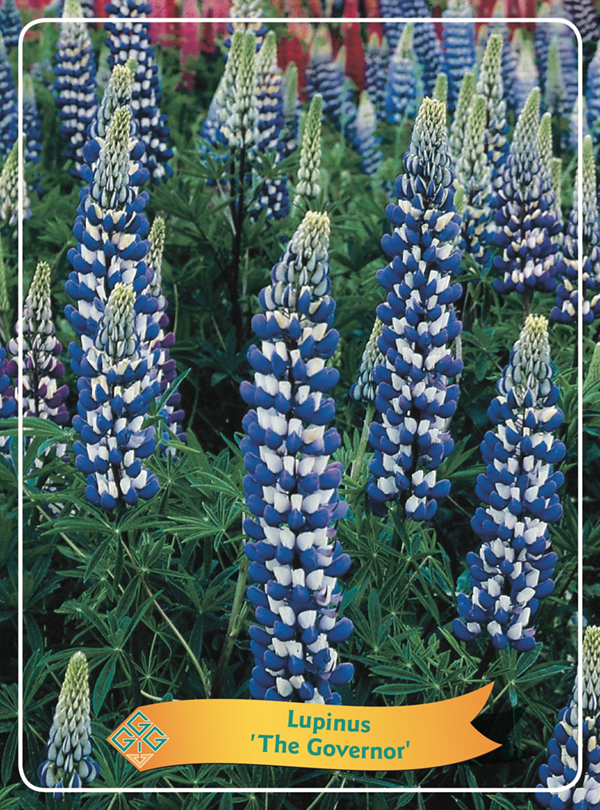 Лупинус „Гувернер“ је запањујућа сорта лупине која се може похвалити високим цветним стабљикама прекривеним густим плаво-белим цветовима. Ова драматична комбинација боја ствара елегантан и аристократски изглед, чинећи биљку дивним акцентом у летњој башти. Цвета од маја до јула, привлачећи пчеле, лептире и друге корисне опрашиваче.