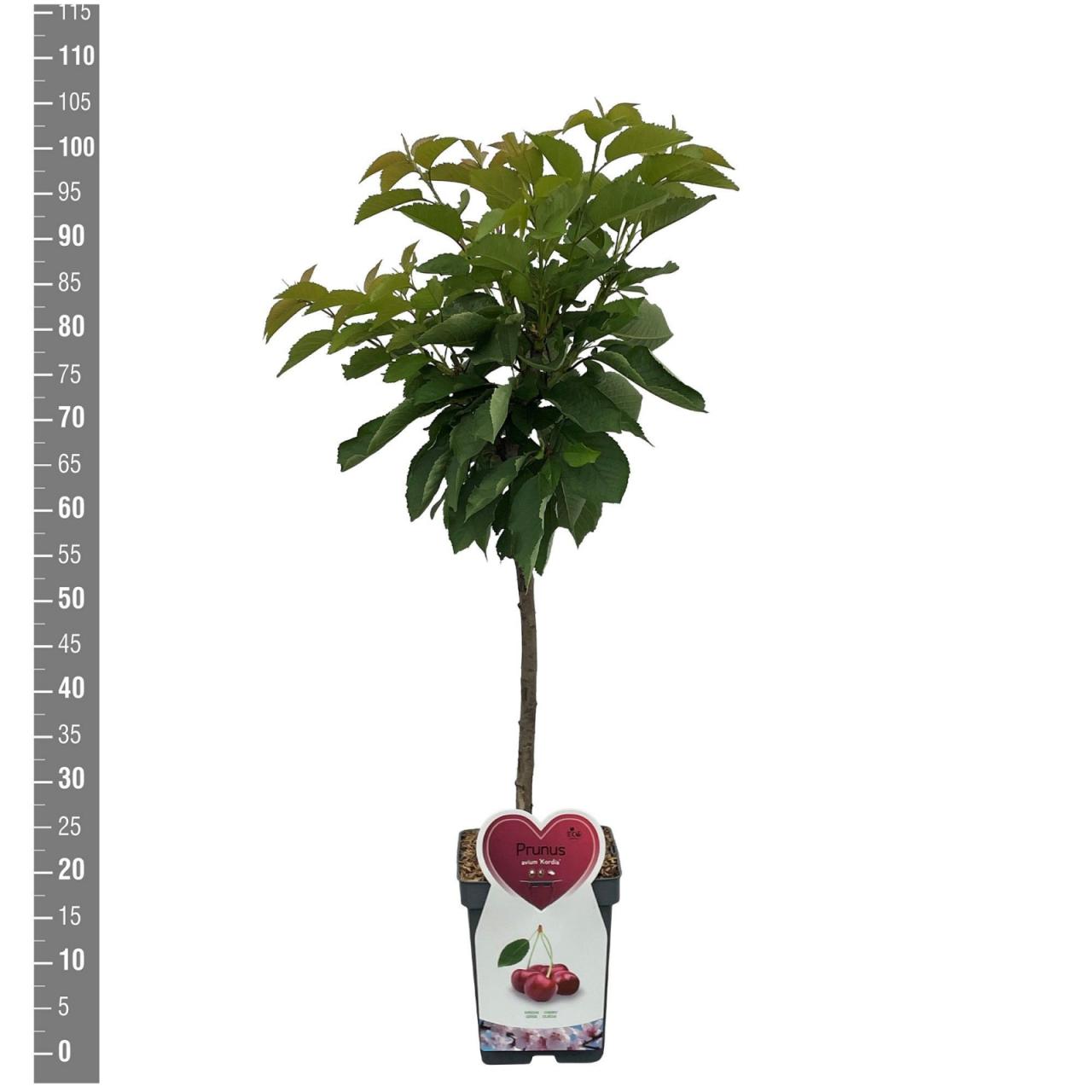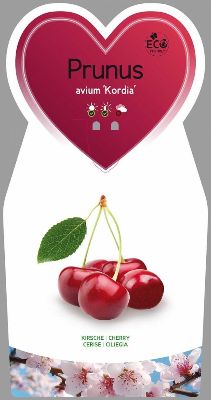 Патуљаста трешња Кордија цвета касно и сазрева у јулу. Плодови су срцоликог облика, средње до дебели, имају дуге дршке, тежине 7-9 грама. Кожица и месо су тамноцрвене боје. Месо је чврсто, веома сочно, ароматично и слатко-киселог укуса. Хрскава је и прилично отпорна на пуцање плодова. Сорта је самоопрашујућа.