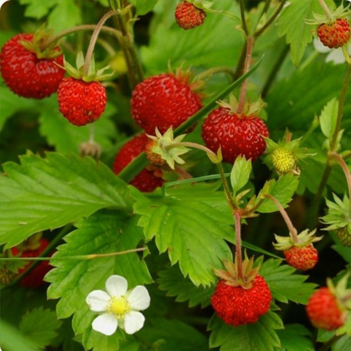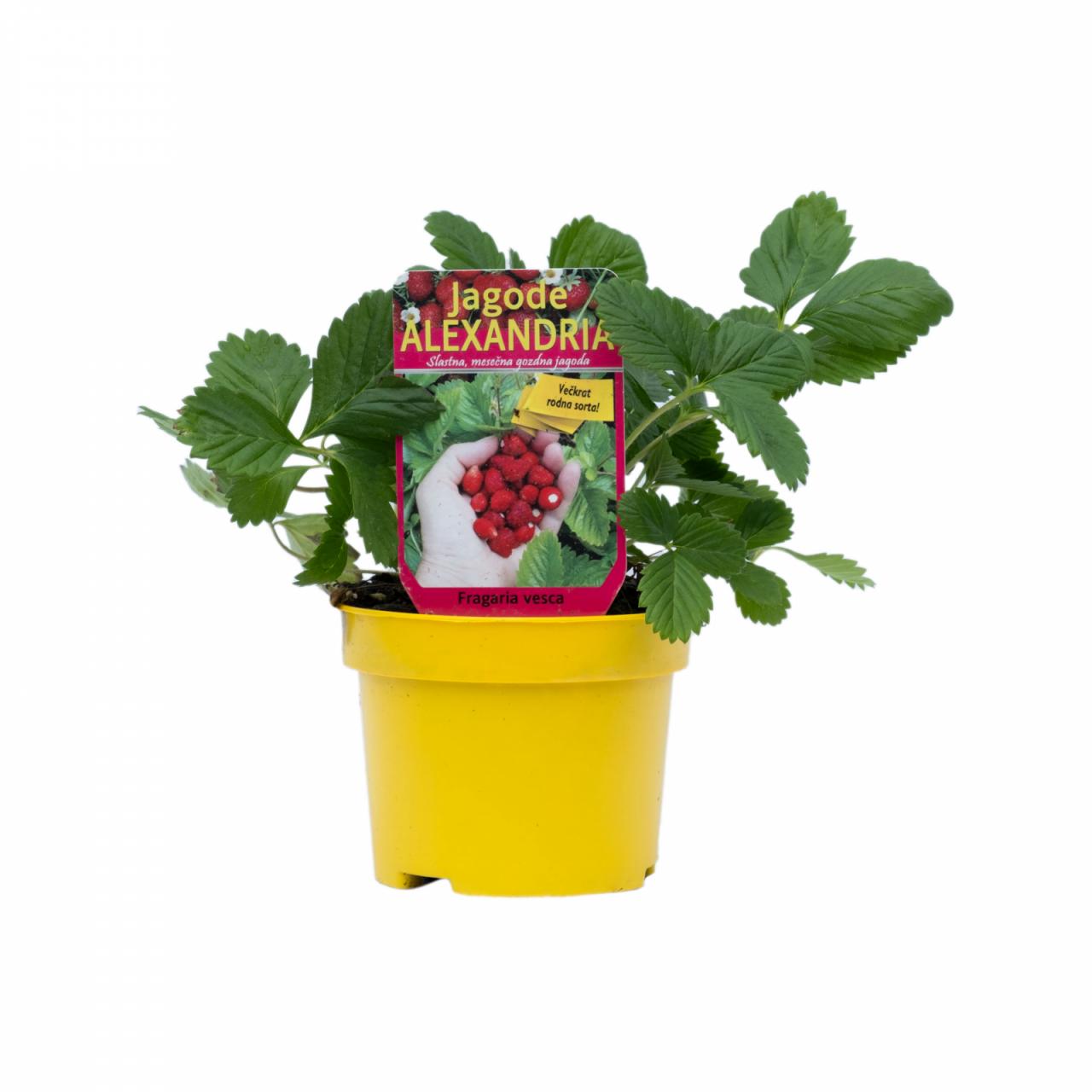 Александријске јагоде су вишеплодне шумске јагоде, које се одликују густом розетом белих цветова и малим, 1,5 цм великим, укусним и тамноцрвеним плодовима. Не формирају живе ограде. Густа лисна розета спречава раст корова.