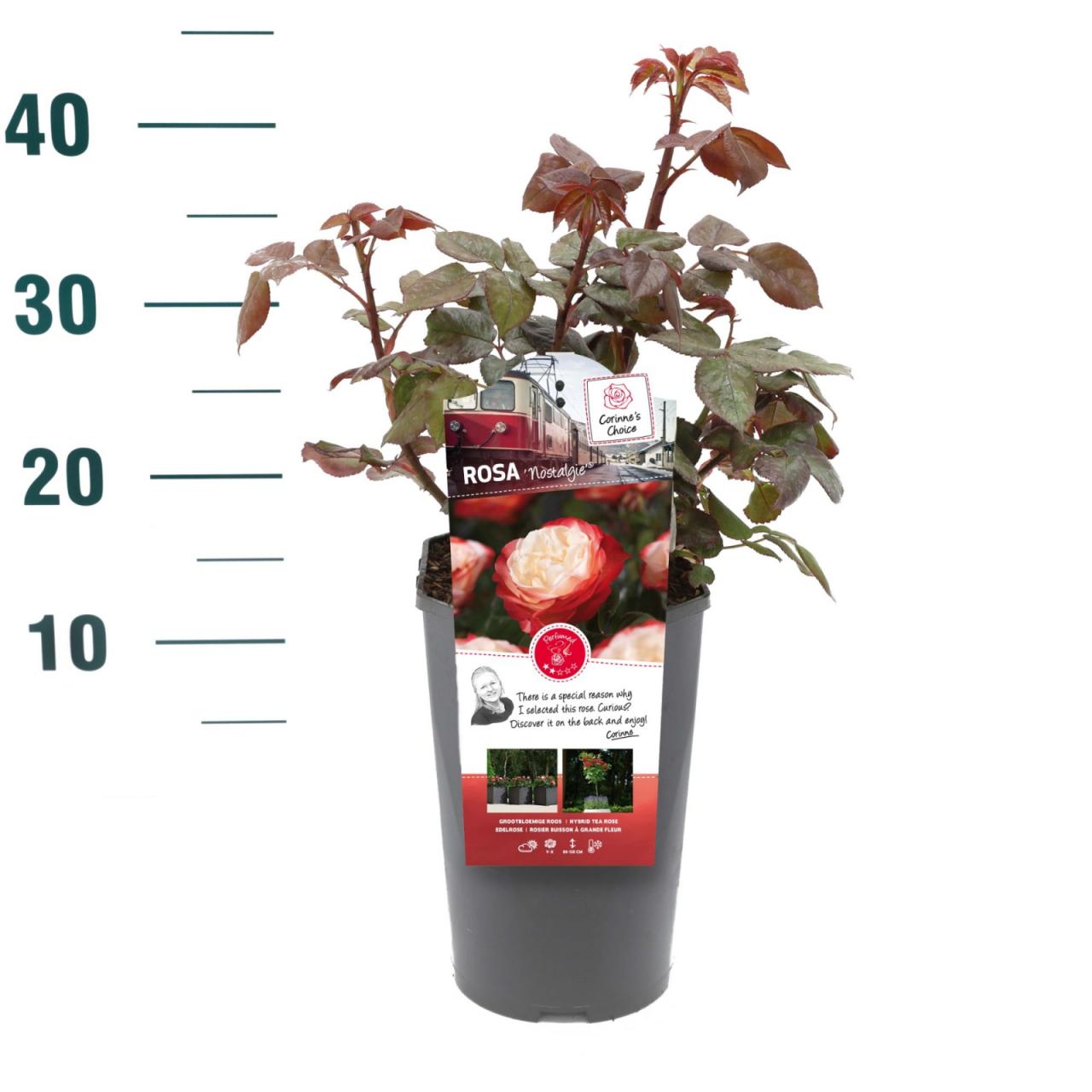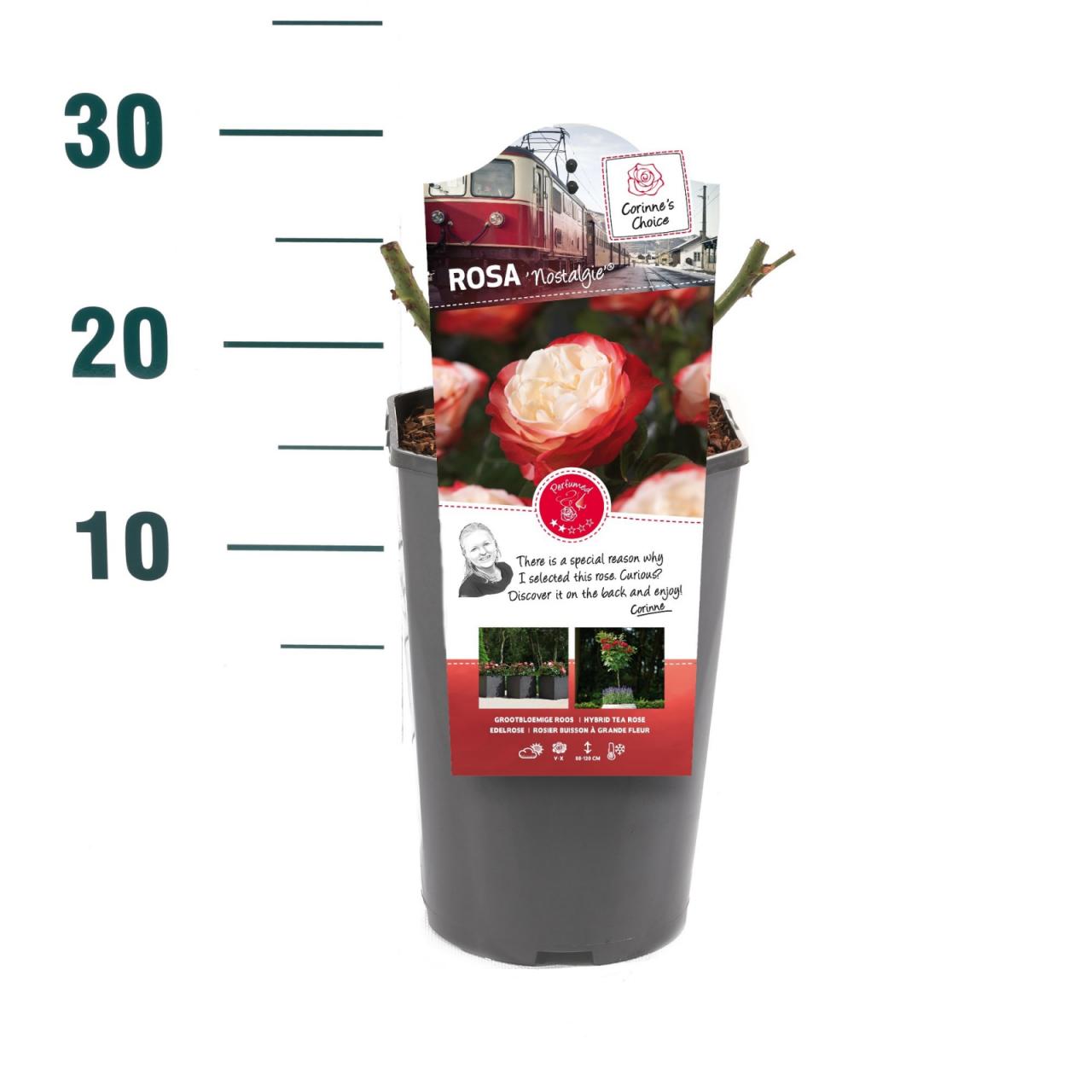 Носталги ружа је усправна, жбунаста ружа са мирисним, кремасто белим цветовима са црвеним ивицама, која цвета од касног пролећа до јесени. То је компактан, лиснат жбун са бодљикавим стабљикама и перасто раздељеним, тамнозеленим, сјајним листовима. Достиже висину до 1 м и ширину до 0,7 м. Сади се на сунчаном месту у обичној, хранљивој баштенској земљи, по могућности тамо где руже раније нису расле.