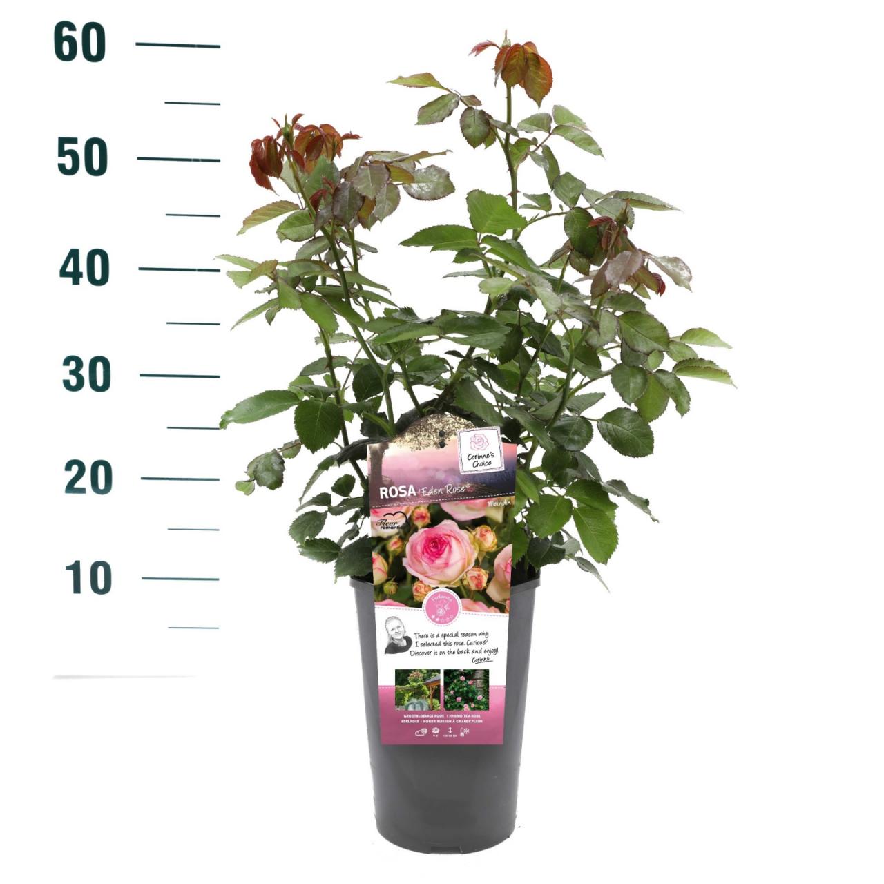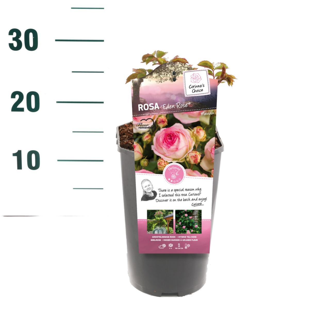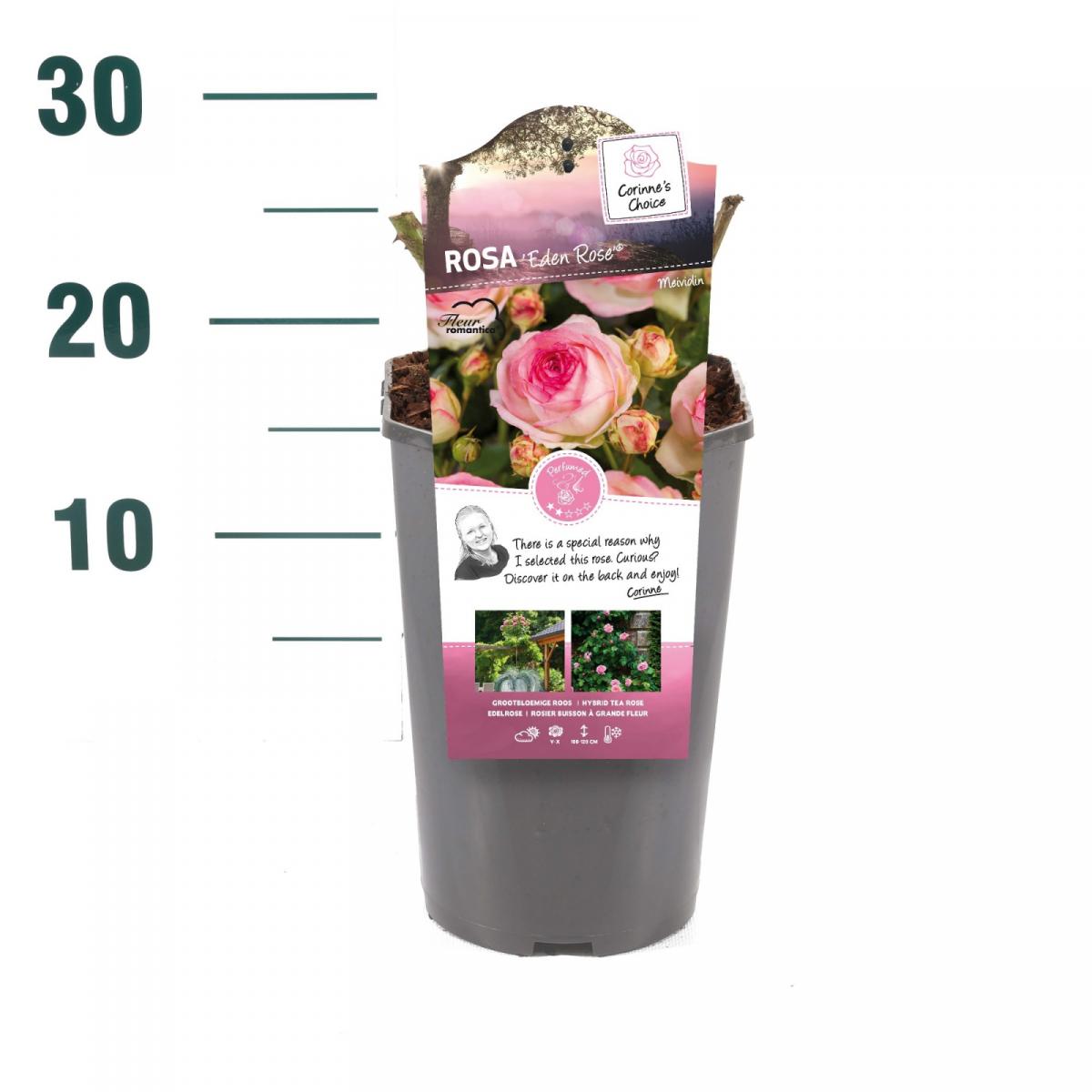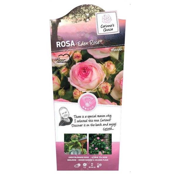 Еденска ружа, позната и као Роза Пјер де Ронсар, очарала је преко милион баштована широм света и заслужила је титулу омиљене руже на свету. Обилни, старомодни, цветови у облику чаше, светло ружичасте боје, могу имати више од 70 латица. Ова пењачица и жбунаста ружа цвета од касног пролећа до касног лета и отпорна је на топлоту. Расте од 1,8 м до 3 м у висину и од 1,5 м до 1,8 м у ширину. Најбоље расте на пуном сунцу или у делимичној хладовини и у средње влажном, добро дренираном земљишту. Обезбедите добру циркулацију ваздуха како бисте спречили развој и ширење болести, подстакли раст и не заборавите да додате летњи малч како бисте задржали влагу. Еденска ружа одлично функционише као самостојећи жбун или као пењачица на зидовима, лејама и оградама.