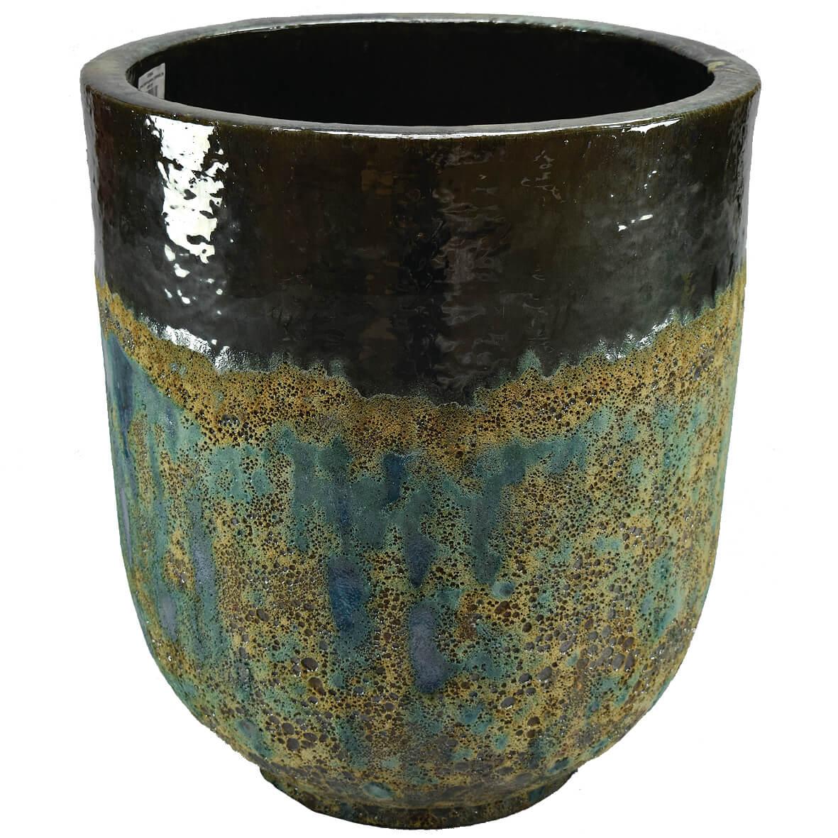 Ова изврсна керамичка саксија за цвеће комбинује софистицирани дизајн и природну лепоту са јединственом комбинацијом текстура и боја. Њен доњи део је украшен карактеристичном грубом површином створеном процесом хемијског нагризања, док горњи обод доноси елеганцију својом глатком тамнозеленом бојом која је у контрасту са природним преливајућим нијансама. Саксија је савршена за оне који траже савршен баланс између рустичног и софистицираног стила.